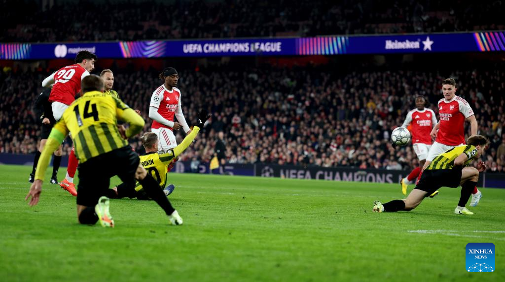 Arsenal's Kai Havertz (top L) scores his goal during the UEFA Champions League football match between Arsenal and Kairat Almaty in London, Britain, Jan. 28, 2026. (Xinhua/Li Ying)