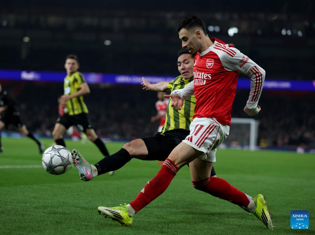 Arsenal's Gabriel Martinelli (R) vies for the ball during the UEFA Champions League football match between Arsenal and Kairat Almaty in London, Britain, Jan. 28, 2026. (Xinhua/Li Ying)