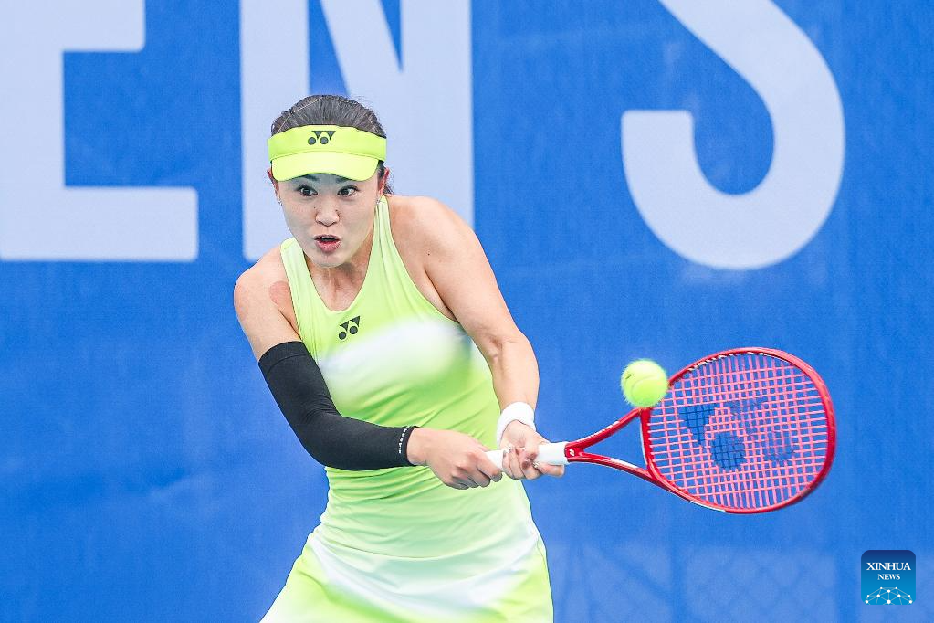 Zhu Lin hits a return during the women's singles round of 16 match between Zhu Lin of China and Mananchaya Sawangkaew of Thailand at the WTA Philippine Women's Open in Manila, the Philippines, Jan. 28, 2026. (Xinhua/Rouelle Umali)
