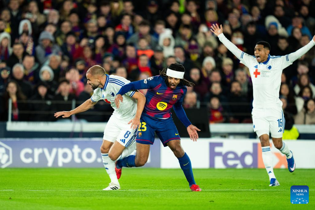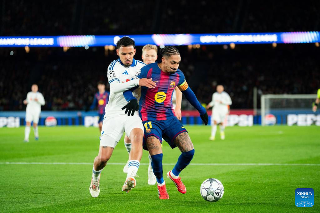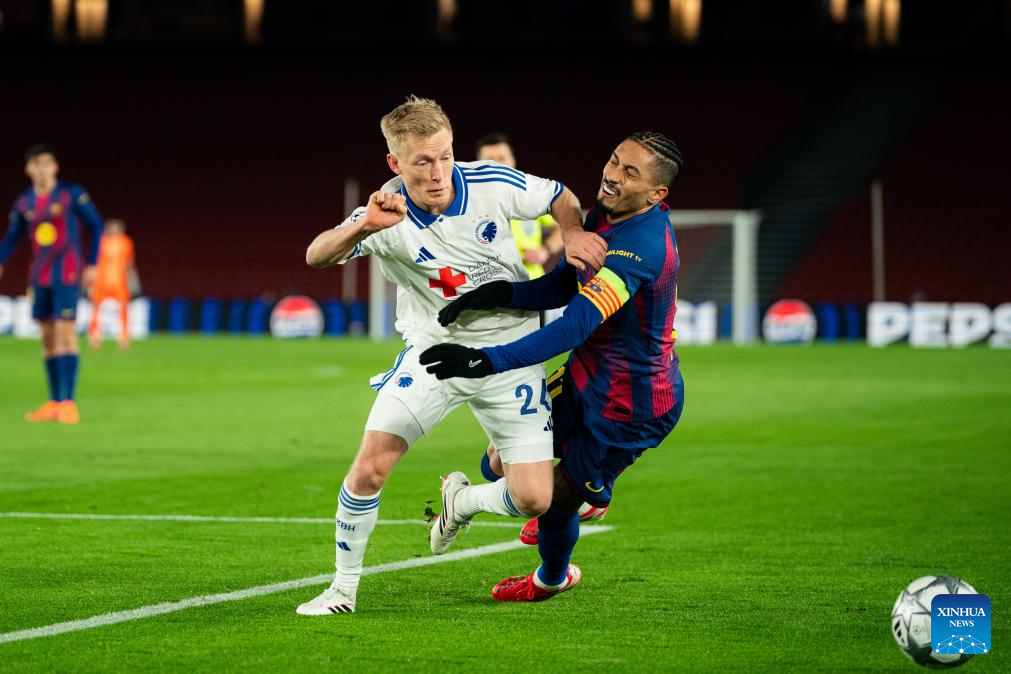 FC Barcelona's Raphinha (R) competes with FC Copenhagen's Birger Meling during the UEFA Champions League 2025/26 league phase match between FC Barcelona and FC Copenhagen in Camp Nou Stadium, Barcelona, Spain, Jan. 28, 2026. (Photo by Joan Gosa/Xinhua)