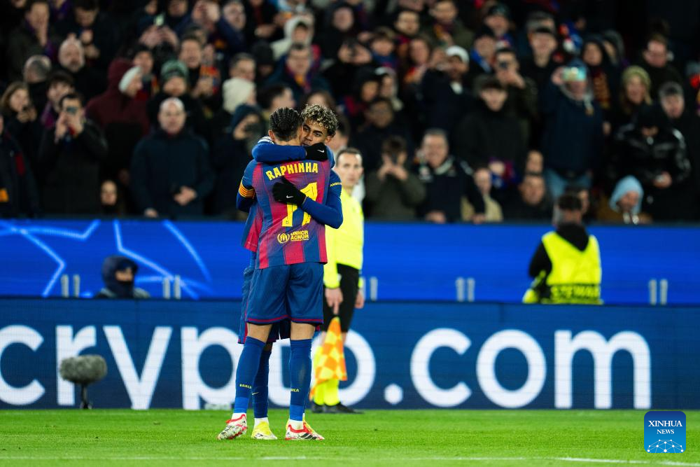 FC Barcelona's Lamine Yamal (rear) celebrates his goal with Raphinha during the UEFA Champions League 2025/26 league phase match between FC Barcelona and FC Copenhagen in Camp Nou Stadium, Barcelona, Spain, Jan. 28, 2026. (Photo by Joan Gosa/Xinhua)