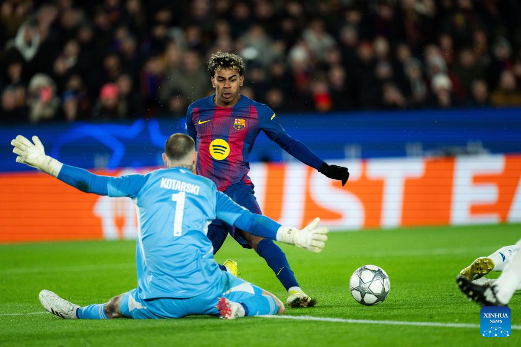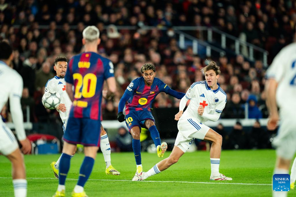 FC Barcelona's Lamine Yamal (C) gets a chance to goal during the UEFA Champions League 2025/26 league phase match between FC Barcelona and FC Copenhagen in Camp Nou Stadium, Barcelona, Spain, Jan. 28, 2026. (Photo by Joan Gosa/Xinhua)