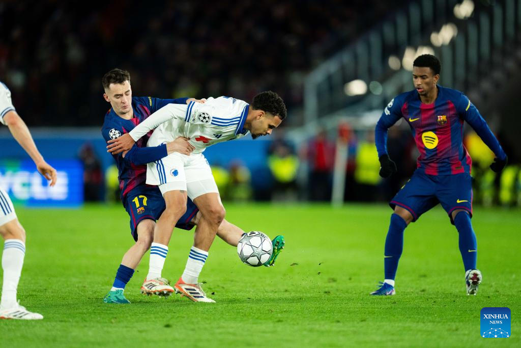 FC Barcelona's Marc Casado (L) vies with FC Copenhagen's Gabriel Pereira (C) during the UEFA Champions League 2025/26 league phase match between FC Barcelona and FC Copenhagen in Camp Nou Stadium, Barcelona, Spain, Jan. 28, 2026. (Photo by Joan Gosa/Xinhua)