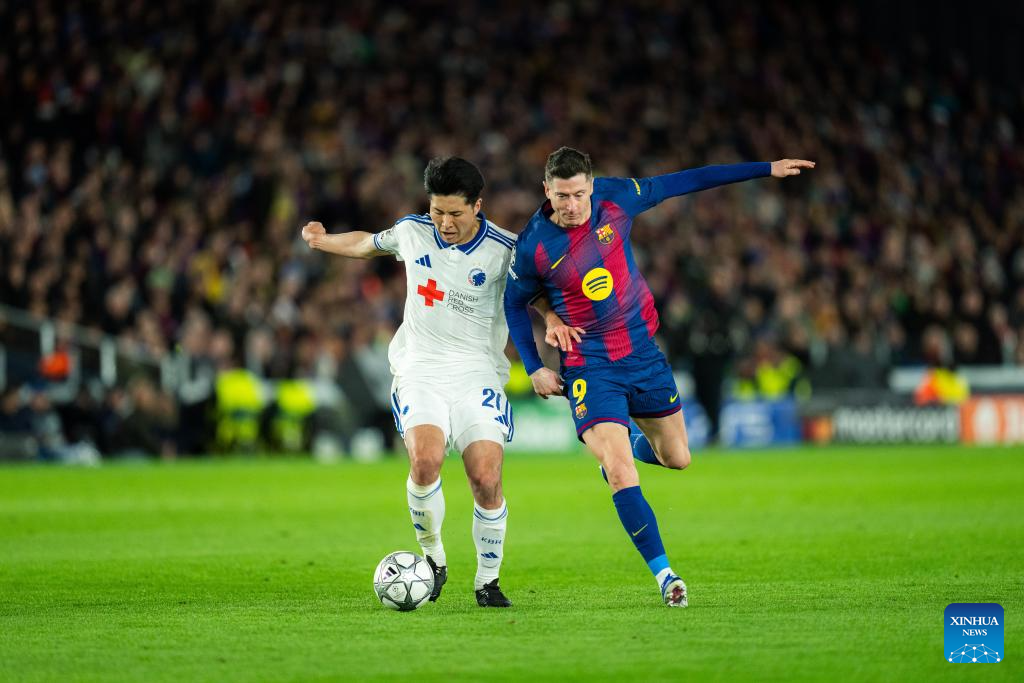 FC Barcelona's Robert Lewandowski (R) vies with FC Copenhagen's Suzuki Junnosuke during the UEFA Champions League 2025/26 league phase match between FC Barcelona and FC Copenhagen in Camp Nou Stadium, Barcelona, Spain, Jan. 28, 2026. (Photo by Joan Gosa/Xinhua)
