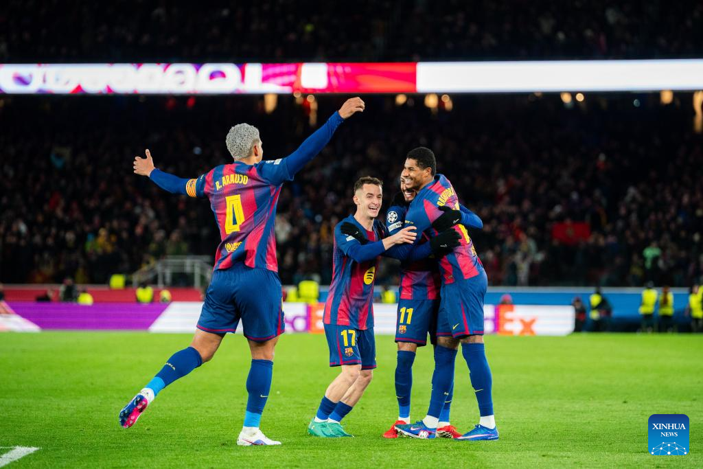 FC Barcelona's players celebrate a goal during the UEFA Champions League 2025/26 league phase match between FC Barcelona and FC Copenhagen in Camp Nou Stadium, Barcelona, Spain, Jan. 28, 2026. (Photo by Joan Gosa/Xinhua)