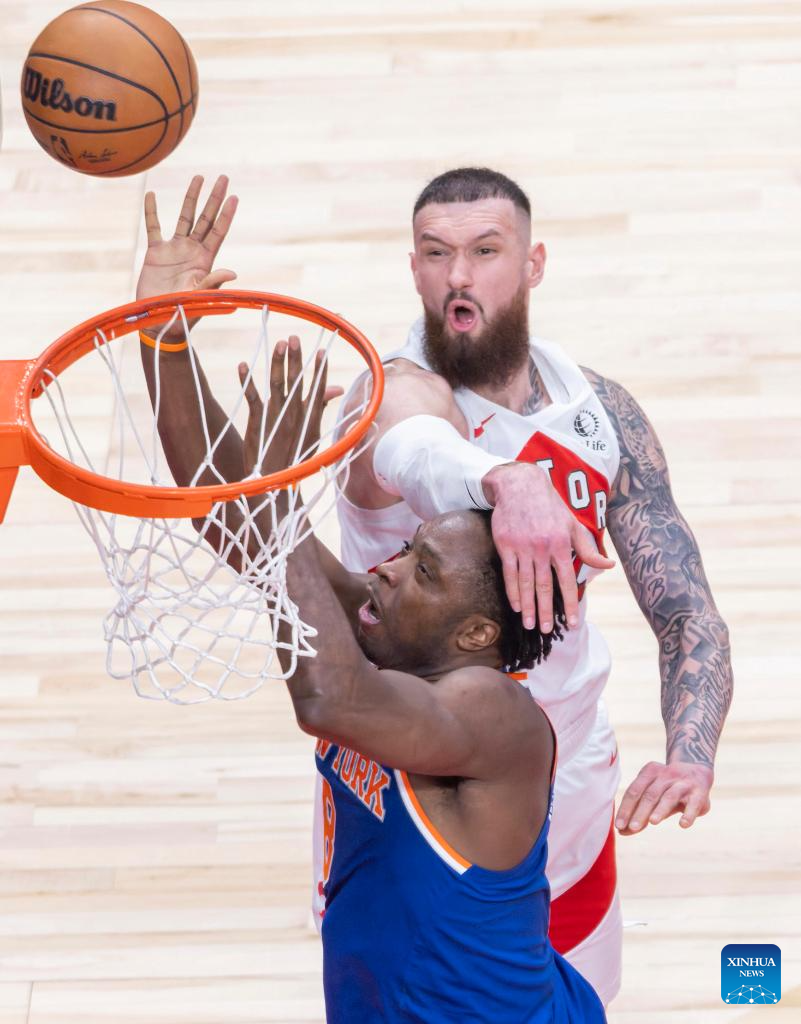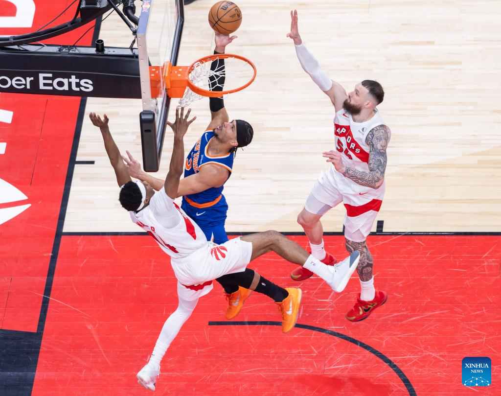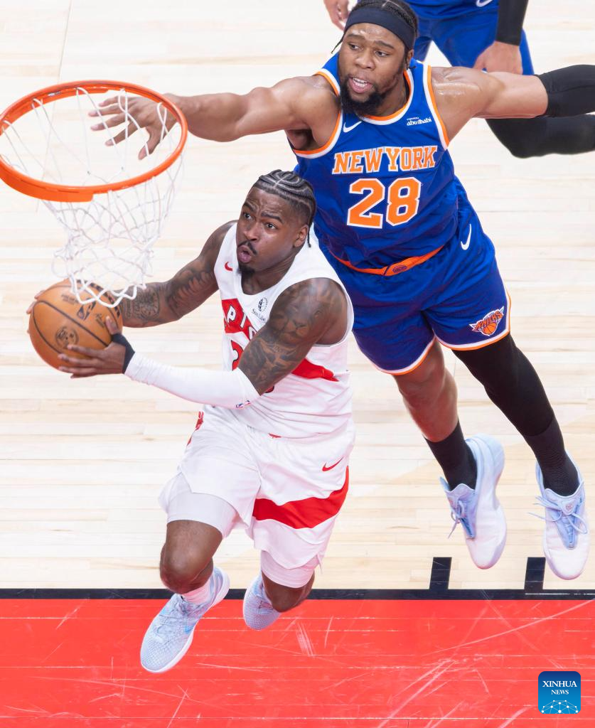 Josh Hart (R) of New York Knicks goes for a layup during the 2025-2026 NBA regular season game between Toronto Raptors and New York Knicks in Toronto, Canada, on Jan. 28, 2026. (Photo by Zou Zheng/Xinhua)