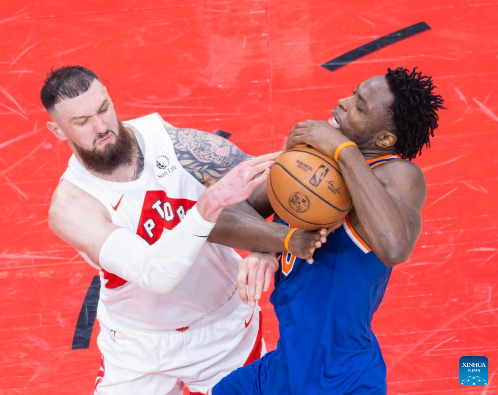 Sandro Mamukelashvili (L) of Toronto Raptors vies with OG Anunoby of New York Knicks during the 2025-2026 NBA regular season game between Toronto Raptors and New York Knicks in Toronto, Canada, on Jan. 28, 2026. (Photo by Zou Zheng/Xinhua)