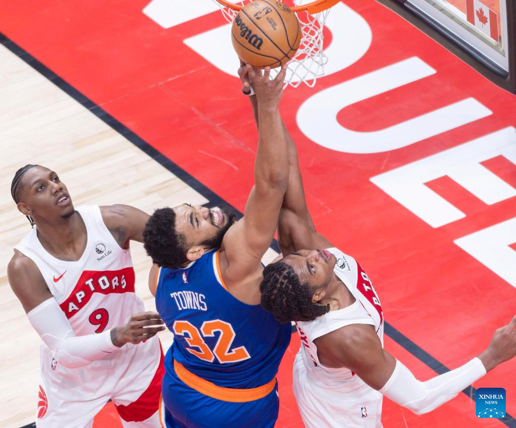 Karl-Anthony Towns (C) of New York Knicks goes for a layup during the 2025-2026 NBA regular season game between Toronto Raptors and New York Knicks in Toronto, Canada, on Jan. 28, 2026. (Photo by Zou Zheng/Xinhua)
