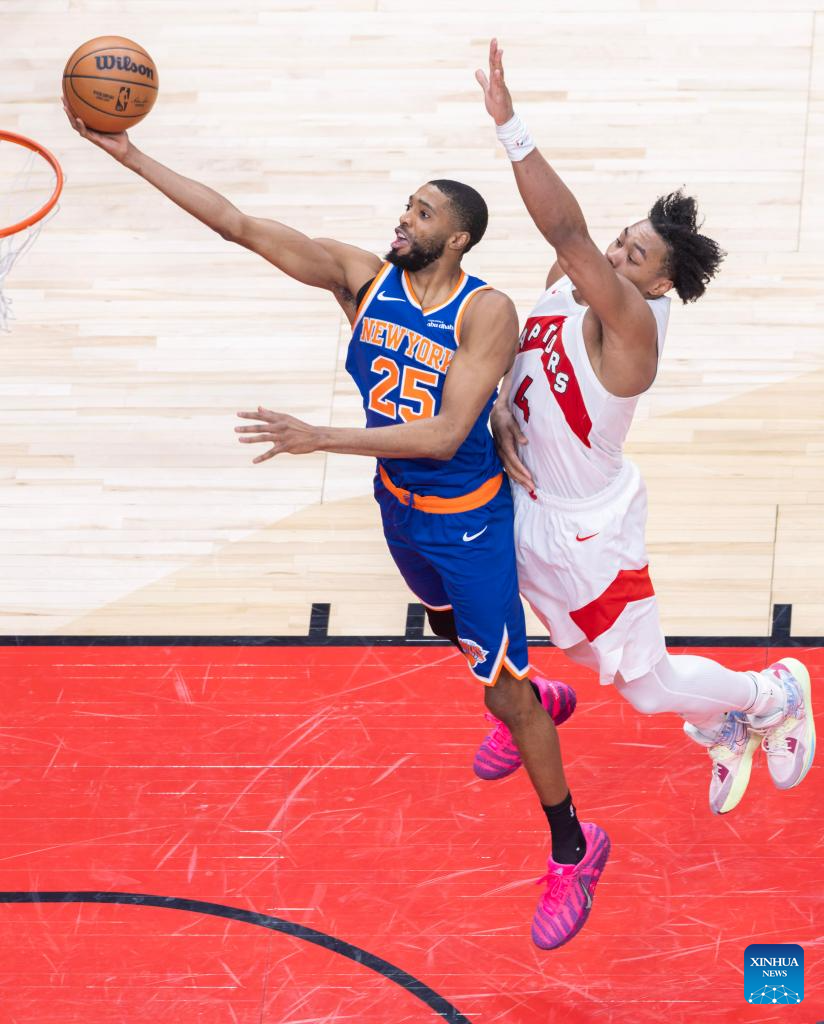 Mikal Bridges (L) of New York Knicks goes up for a layup during the 2025-2026 NBA regular season game between Toronto Raptors and New York Knicks in Toronto, Canada, on Jan. 28, 2026. (Photo by Zou Zheng/Xinhua)