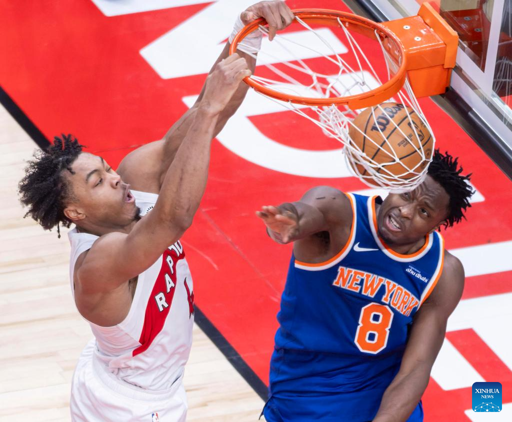 Scottie Barnes (L) of Toronto Raptors dunks during the 2025-2026 NBA regular season game between Toronto Raptors and New York Knicks in Toronto, Canada, on Jan. 28, 2026. (Photo by Zou Zheng/Xinhua)