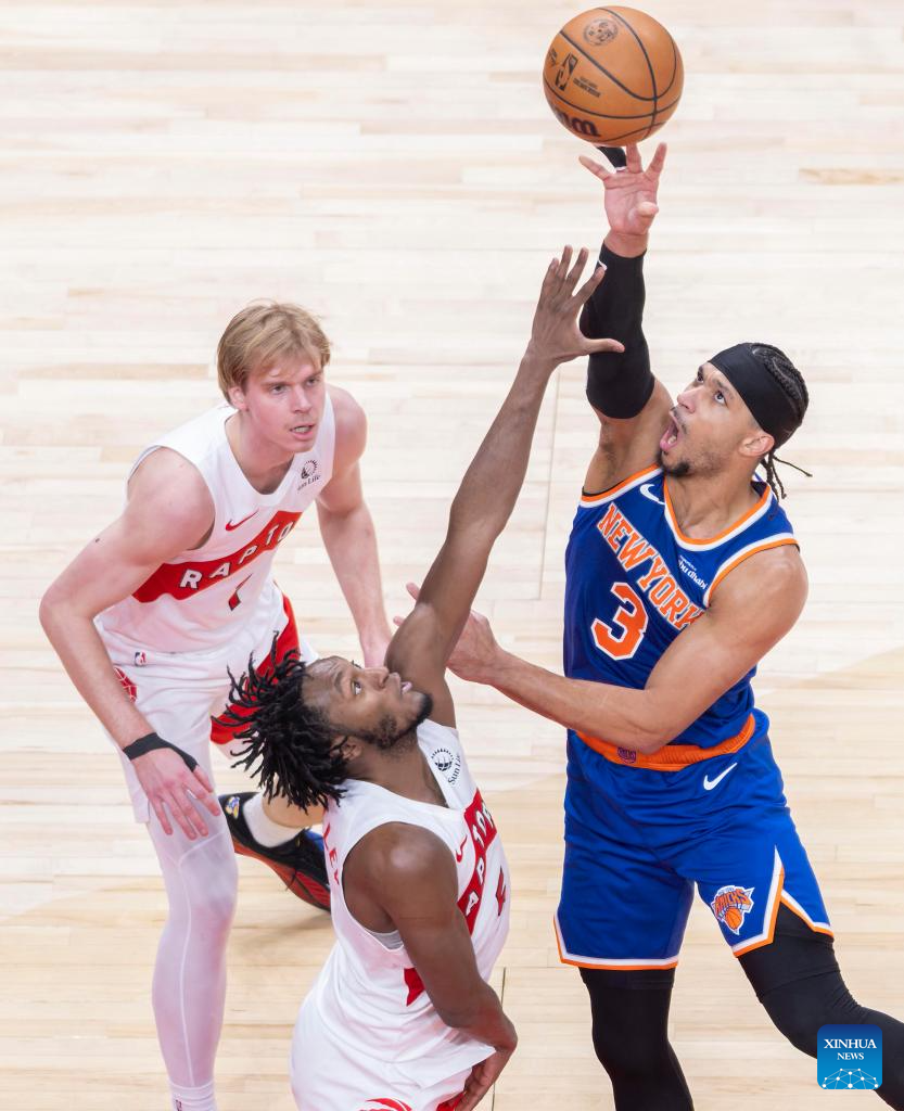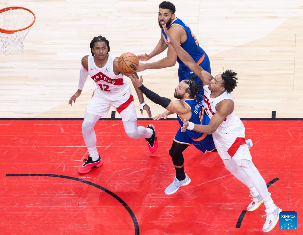Collin Murray-Boyles (R) of Toronto Raptors fights for a rebound with Karl-Anthony Towns (C) of New York Knicks during the 2025-2026 NBA regular season game between Toronto Raptors and New York Knicks in Toronto, Canada, on Jan. 28, 2026. (Photo by Zou Zheng/Xinhua)