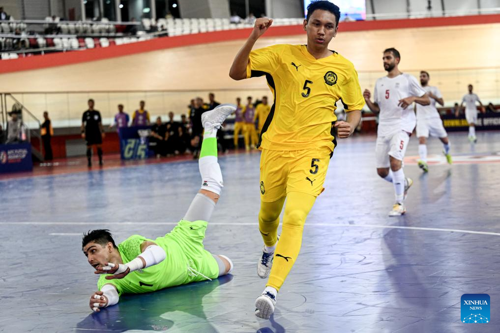 Mohamad Alalluddin Nawi (C) of Malaysia celebrates scoring during the group D match between Iran and Malaysia at the AFC Futsal Asian Cup 2026 in Jakarta, Indonesia, Jan. 28, 2026. (Xinhua/Agung Kuncahya B.)