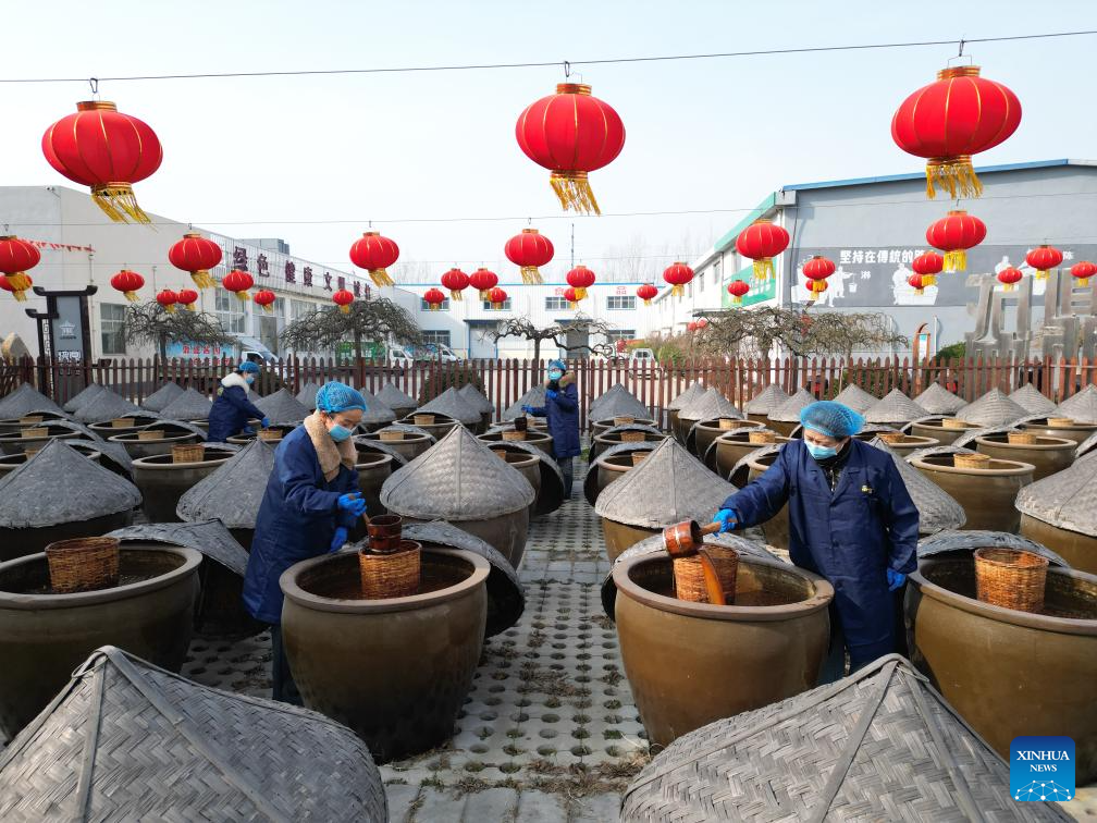 Employees stir fermenting soy sauce at a traditional brewery in Tengzhou, east China's Shandong Province, on Jan. 29, 2026. (Photo by Song Haicun/Xinhua)