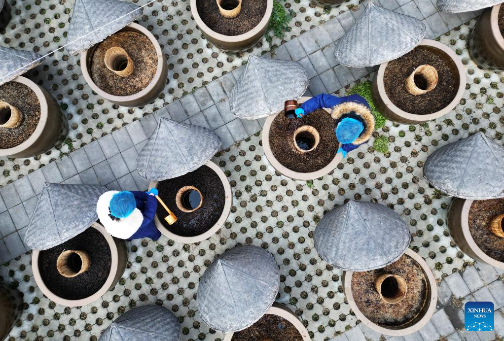 A drone photo taken on Jan. 29, 2026 shows employees stirring fermenting soy sauce at a traditional brewery in Tengzhou, east China's Shandong Province. (Photo by Li Zhijun/Xinhua)
