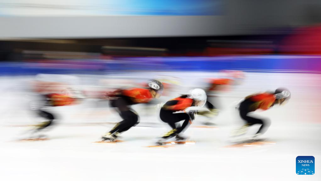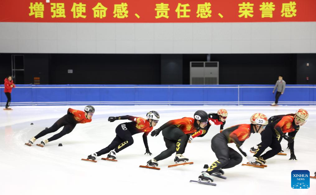 Skaters of China's short track speed skating team take part in a training session ahead of the upcoming Milan-Cortina 2026 Winter Olympics in Beijing, China, Jan. 29, 2026. (Xinhua/Li Ming)