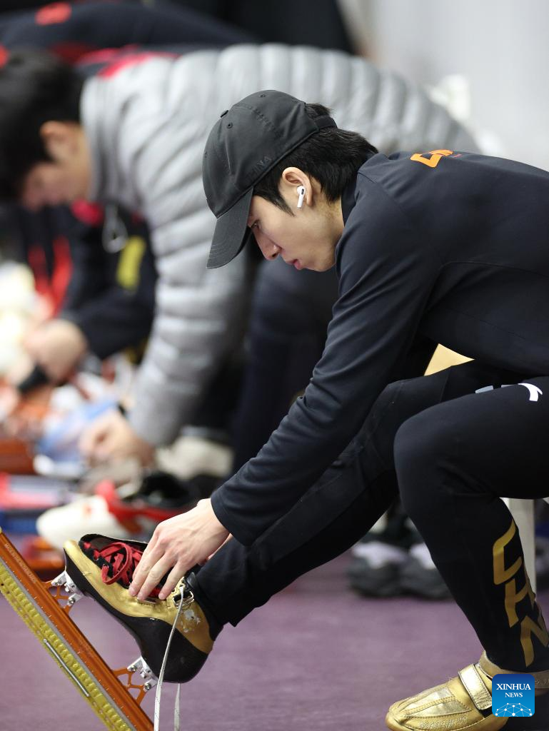 Chinese short track speed skater Lin Xiaojun puts on his skates before attending a training session ahead of the upcoming Milan-Cortina 2026 Winter Olympics in Beijing, China, Jan. 29, 2026. (Xinhua/Zhang Chen)
