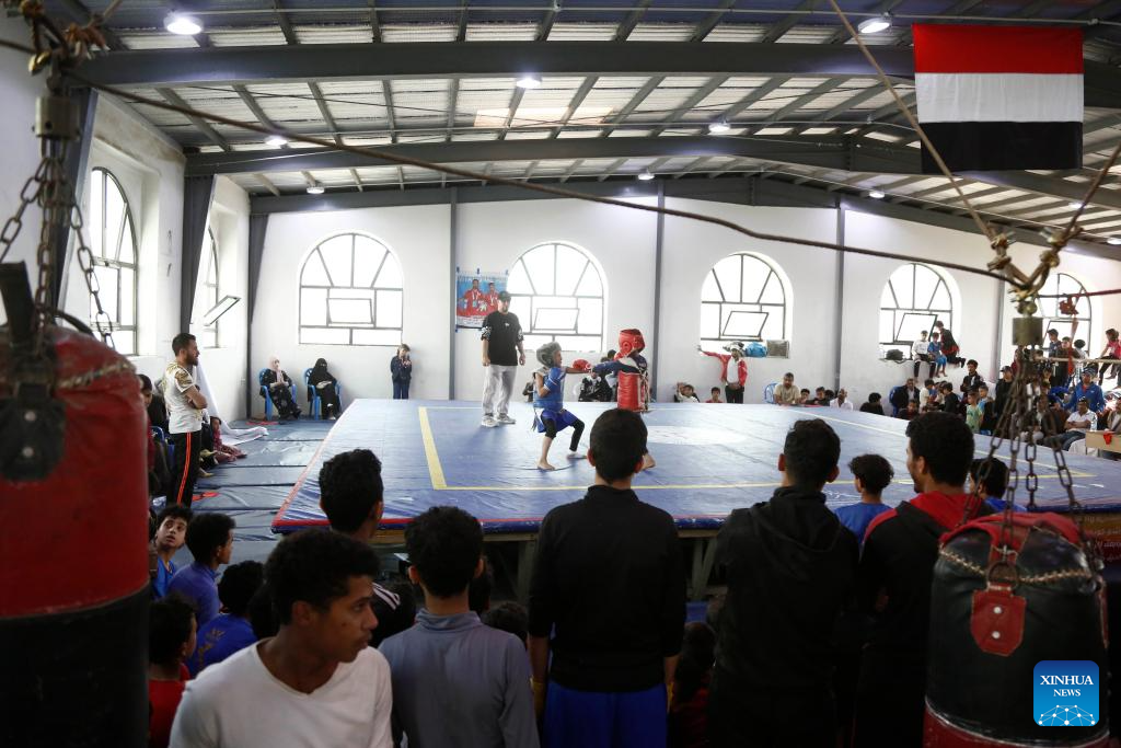 Yemeni junior competitors fight during a Wushu and Kung Fu competition in Sanaa, Yemen, on Jan. 28, 2026. (Photo by Mohammed Mohammed/Xinhua)