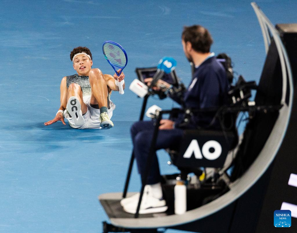 Ben Shelton reacts during the men's singles quarterfinal match between Ben Shelton of the United States and Jannik Sinner of Italy at the Australian Open tennis tournament in Melbourne, Australia, Jan. 28, 2026. (Photo by Hu Jingchen/Xinhua)
