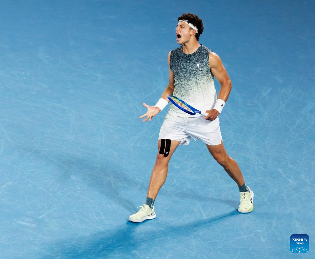 Ben Shelton celebrates scoring during the men's singles quarterfinal match between Ben Shelton of the United States and Jannik Sinner of Italy at the Australian Open tennis tournament in Melbourne, Australia, Jan. 28, 2026. (Photo by Hu Jingchen/Xinhua)