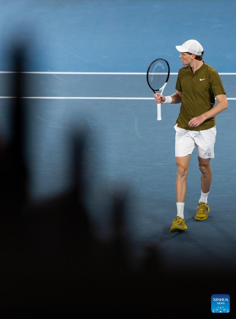 Jannik Sinner reacts during the men's singles quarterfinal match between Ben Shelton of the United States and Jannik Sinner of Italy at the Australian Open tennis tournament in Melbourne, Australia, Jan. 28, 2026. (Photo by Hu Jingchen/Xinhua)