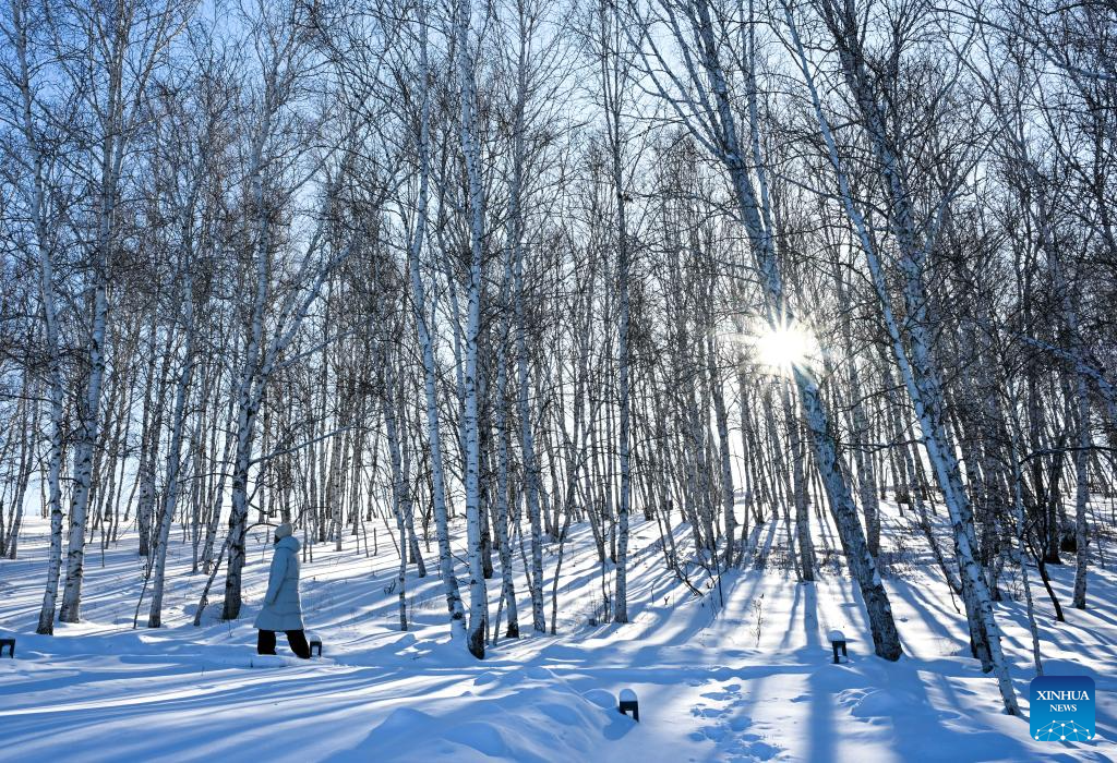 A tourist walks in birch woods in Yakeshi of Hulun Buir, north China's Inner Mongolia Autonomous Region, Jan. 21, 2026. Yakeshi has been an important base for cold-area automotive testing due to its long and freezing winter season. A large number of engineers and technicians pay regular visit for business purpose to the city during the winter, but they also become a stable client group for other services available here.