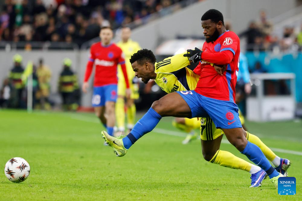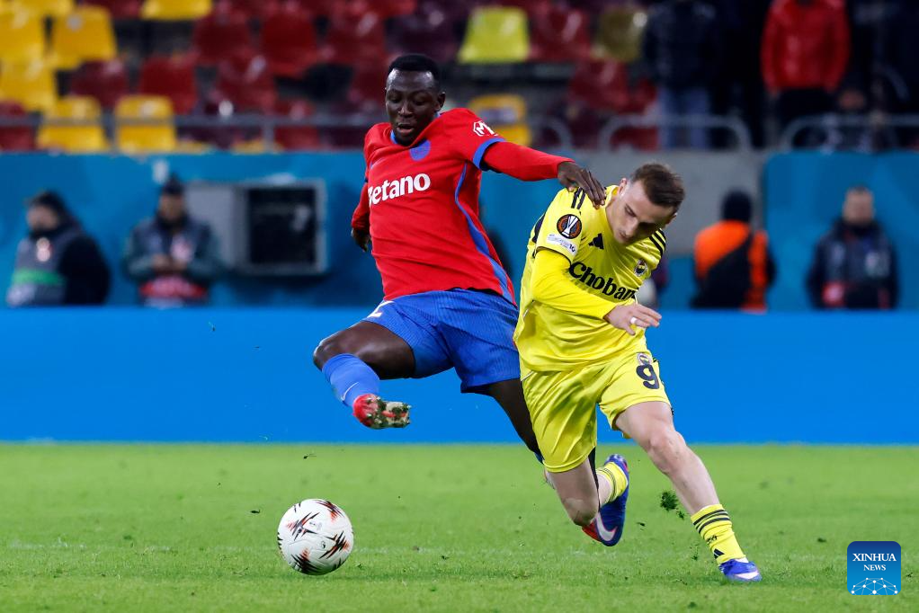 FCSB's Mamadou Thiam (R) vies with Fenerbahce's Nelson Semedo during the UEFA Europa League football match between Fenerbahce and FCSB at Arena Nationala stadium in Bucharest, Romania, Jan. 29, 2026. (Photo by Cristian Cristel/Xinhua)