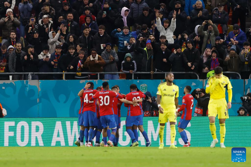 FCSB's players celebrate scoring during the UEFA Europa League football match between Fenerbahce and FCSB at Arena Nationala stadium in Bucharest, Romania, Jan. 29, 2026. (Photo by Cristian Cristel/Xinhua)