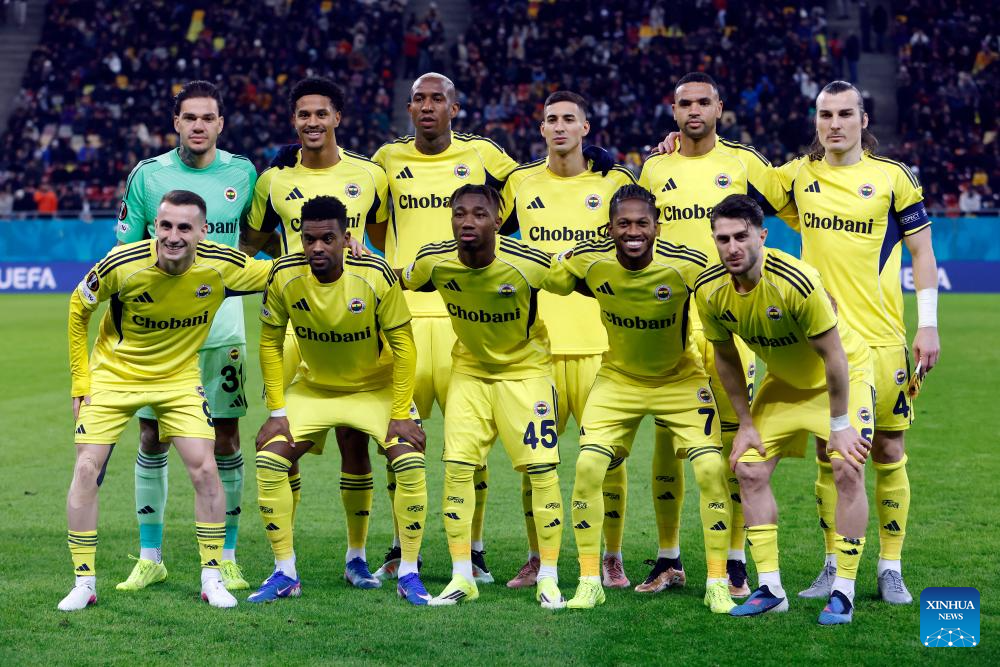 Fenerbahce's players pose before the UEFA Europa League football match between Fenerbahce and FCSB at Arena Nationala stadium in Bucharest, Romania, Jan. 29, 2026. (Photo by Cristian Cristel/Xinhua)