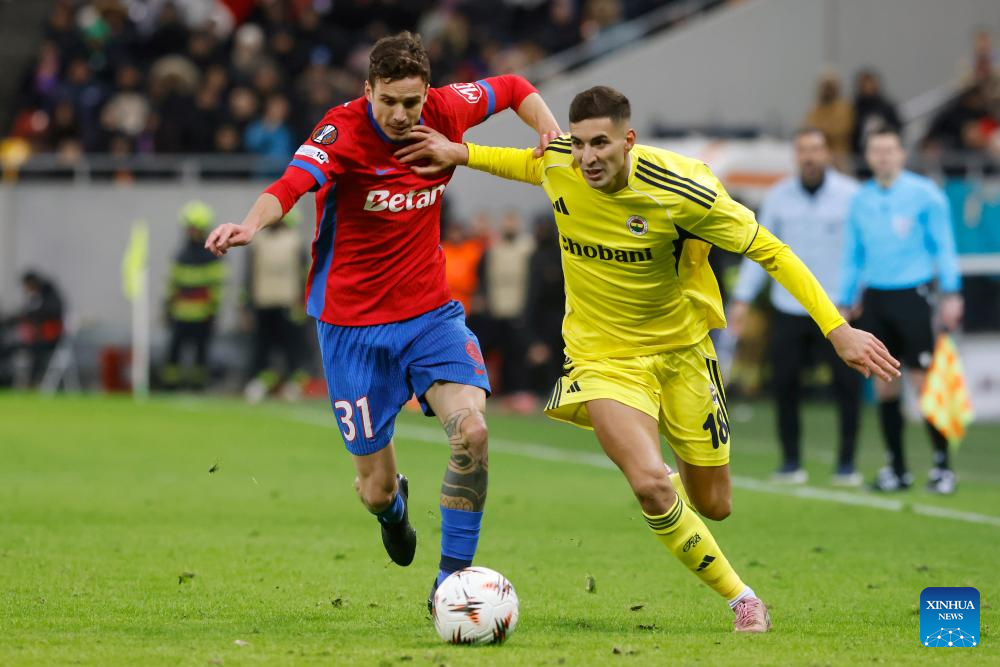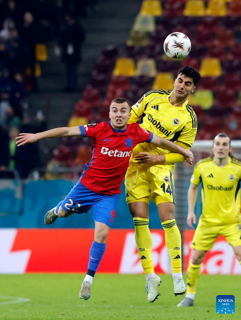 FCSB's Mihai Toma (L) vies with Fenerbahce's Yigit Efe Demir during the UEFA Europa League football match between Fenerbahce and FCSB at Arena Nationala stadium in Bucharest, Romania, Jan. 29, 2026. (Photo by Cristian Cristel/Xinhua)