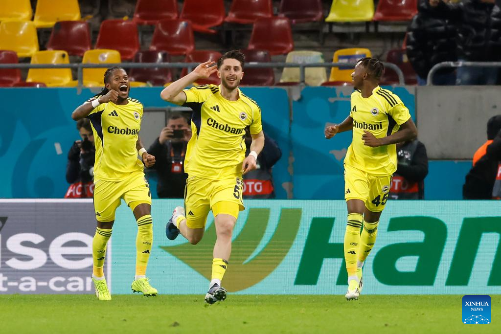 Fenerbahce's Ismail Yuksek (C) celebrates scoring during the UEFA Europa League football match between Fenerbahce and FCSB at Arena Nationala stadium in Bucharest, Romania, Jan. 29, 2026. (Photo by Cristian Cristel/Xinhua)