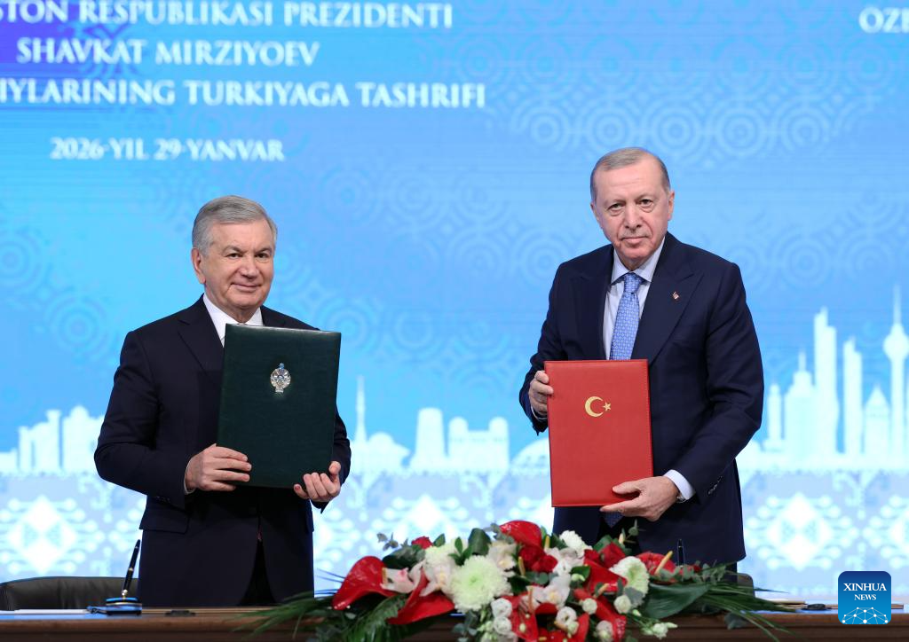 Turkish President Recep Tayyip Erdogan (R) and visiting Uzbek President Shavkat Mirziyoyev display the signed agreement at the Presidential Complex in Ankara, Türkiye, Jan. 29, 2026. Türkiye and Uzbekistan should deepen cooperation across political, economic and cultural fields, said Turkish President Recep Tayyip Erdogan on Thursday.Erdogan made the remarks at a joint press conference with visiting Uzbek President Shavkat Mirziyoyev in Ankara. (Mustafa Kaya/Handout via Xinhua)