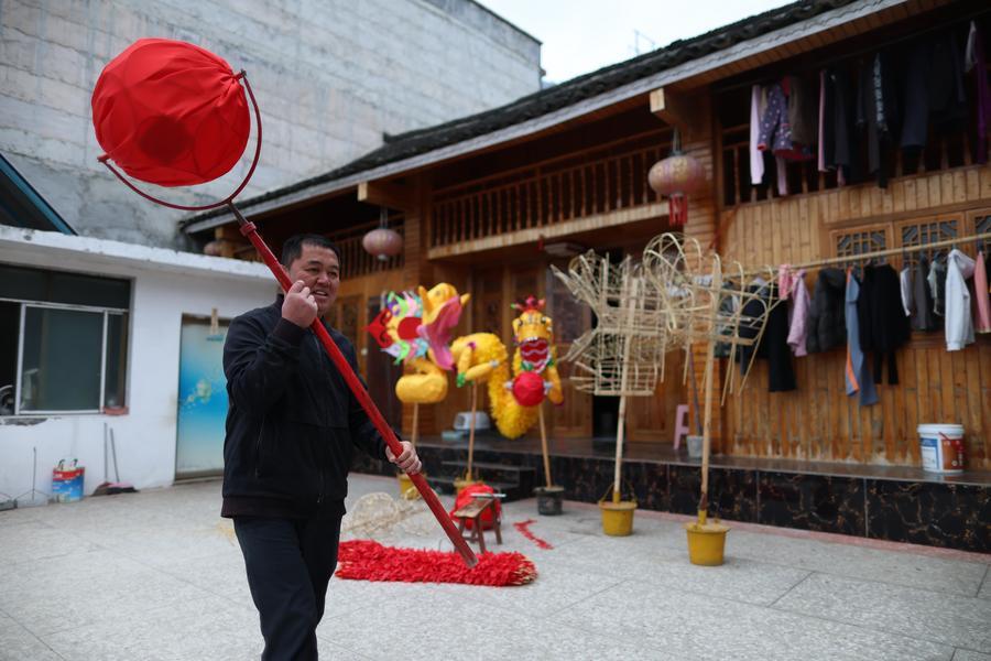 SHIQIAN, Jan. 30 (Xinhua) -- The "Maolong (hairy dragon) Festival" of Gelao ethnic group is a national-level intangible cultural heritage. Maolong lanterns, the theme artifacts of the Maolong Festival, is a school of dragon lanterns unique to Shiqian.