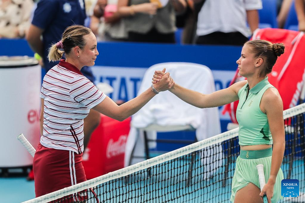 Donna Vekic (L) of Croatia greets Tatiana Prozorova of Russia after their women's singles semifinal match at the WTA Philippine Women's Open in Manila, the Philippines, Jan. 30, 2026. (Xinhua/Rouelle Umali)