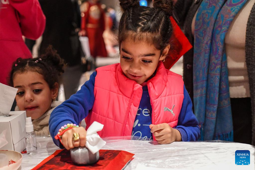 A child tries rubbing print techniques during a culture and tourism promotion event for Xiamen City of southeast China's Fujian Province, in Cairo, Egypt, Jan. 29, 2026. (Xinhua/Xin Mengchen)