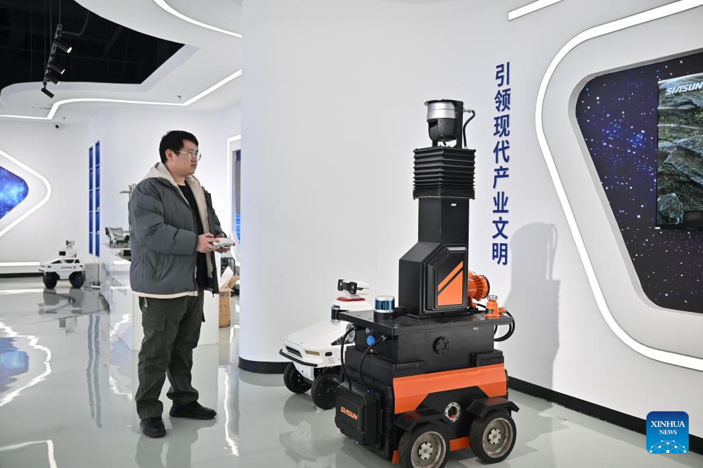 A staff member operates a patrol robot for mining purpose at Tianjin SIASUN Intelligent Technology Co., Ltd. in the Beijing-Tianjin Zhongguancun Tech Town, in Tianjin, north China, Jan. 30, 2026.