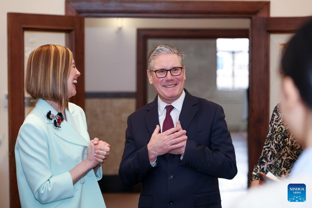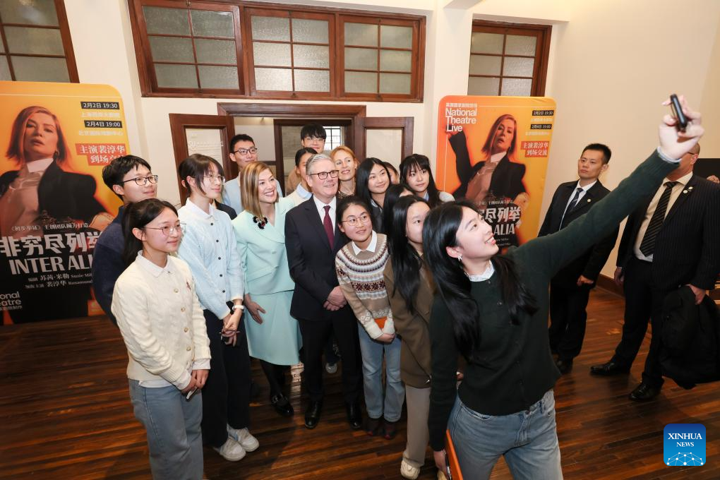 British Prime Minister Keir Starmer communicates with cast and crew members of "Matilda the Musical" during his visit at the Design Innovation Institute Shanghai in east China's Shanghai, Jan. 31, 2026. (Xinhua/Wang Xiang)