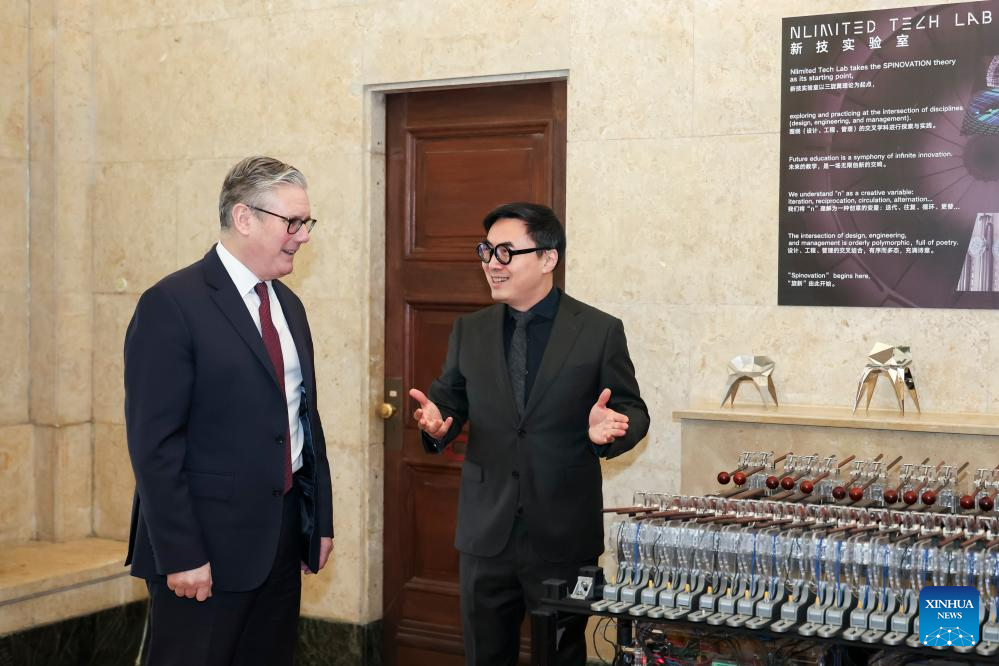 Lou Yongqi, president of Shanghai University of Engineering Science, introduces for British Prime Minister Keir Starmer during Starmer's visit at the Design Innovation Institute Shanghai in east China's Shanghai, Jan. 31, 2026. (Xinhua/Wang Xiang)