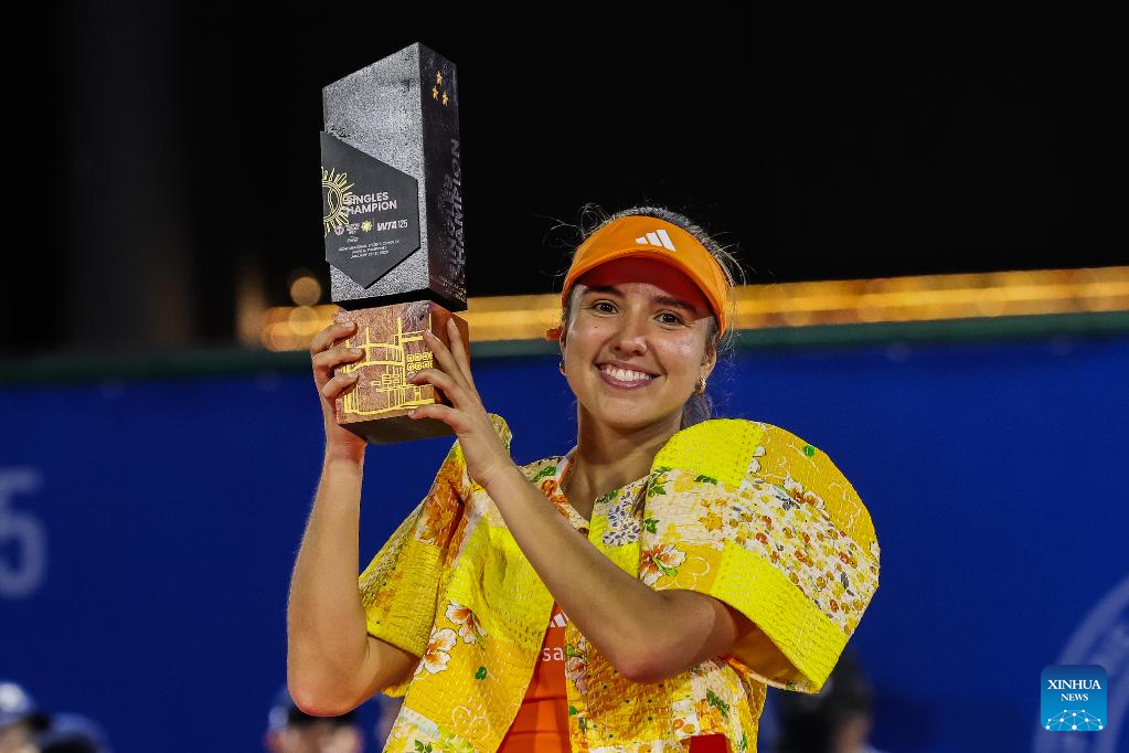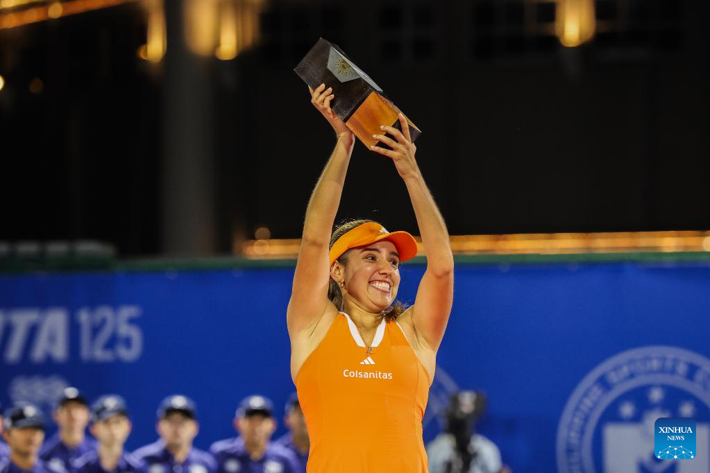 Camila Osorio of Colombia raises the champion's trophy during the awarding ceremony for the women's singles at the WTA Philippine Women's Open in Manila, the Philippines, Jan. 31, 2026. (Xinhua/Rouelle Umali)