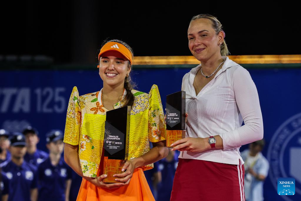 Camila Osorio (L) of Colombia and Donna Vekic of Croatia pose with their trophies during the awarding ceremony for the women's singles at the WTA Philippine Women's Open in Manila, the Philippines, Jan. 31, 2026. (Xinhua/Rouelle Umali)