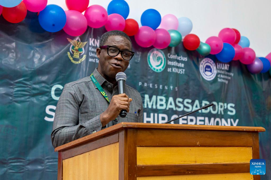 Daniel Duah, the Ghanaian director of the Confucius Institute at the Kwame Nkrumah University of Science and Technology (KNUST), speaks at the award ceremony of the Chinese Ambassador's Scholarship in Kumasi, Ghana, Jan. 30, 2026. The Confucius Institute at the KNUST in collaboration with the Chinese Embassy in Ghana on Friday awarded 71 KNUST cadets the Chinese Ambassador's Scholarship in Kumasi, Ghana's second-largest city. (KNUST Confucius Institute/Handout via Xinhua)