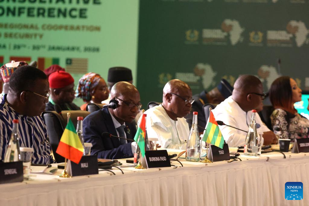 Guests attend the Presidential meeting of the High-Level Consultative Conference on Regional Cooperation and Security in Accra, Ghana, on Jan 30, 2026. Ghanaian President John Dramani Mahama on Friday called for a strengthened solidarity in the West Africa and Sahel region to ensure a united front in the fight to subdue terrorism and other acts of violence. Mahama said during the opening of the Presidential meeting of the two-day High-Level Consultative Conference on Regional Cooperation and Security in Accra, the Ghanaian capital, that since the issue of terrorism and violent extremism confronts the entire subregion, it is important to fight it together with a united front. (Xinhua/Seth)