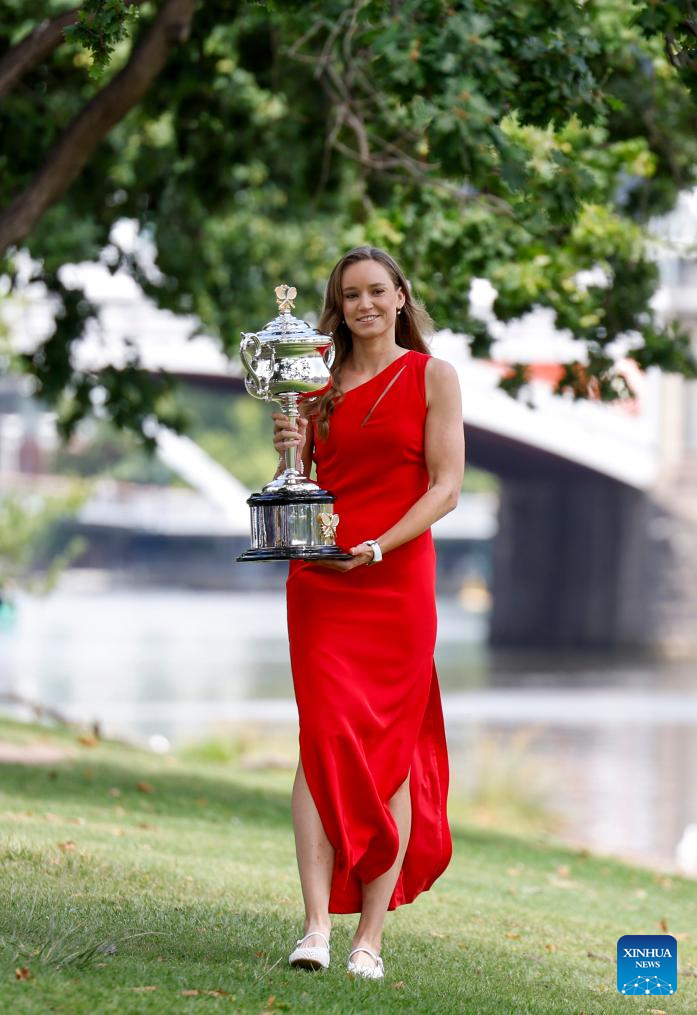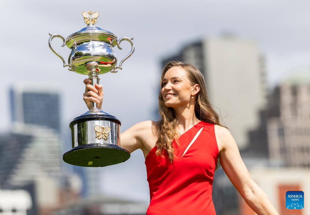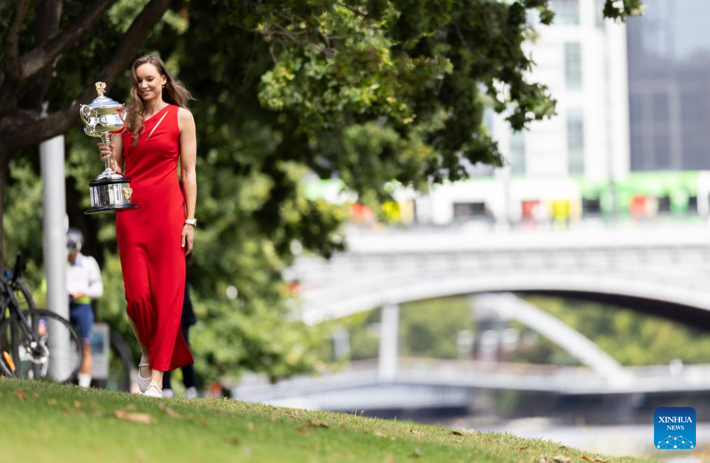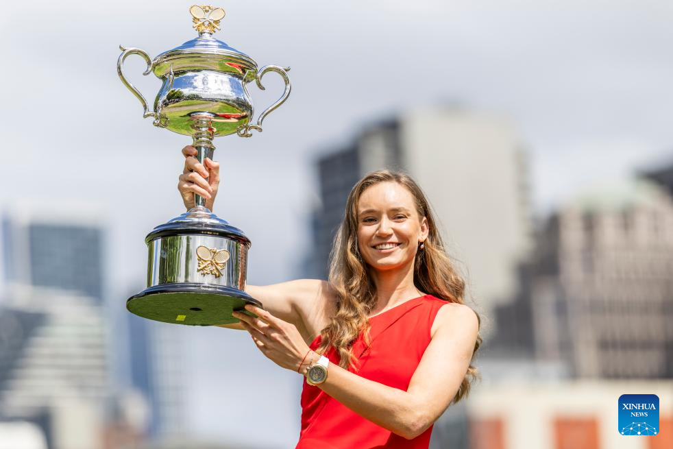 Elena Rybakina of Kazakhstan poses with the trophy during the Australian Open winner photo shoot near Yarra River, Melbourne, Australia, Feb. 1, 2026. (Xinhua/Ma Ping)