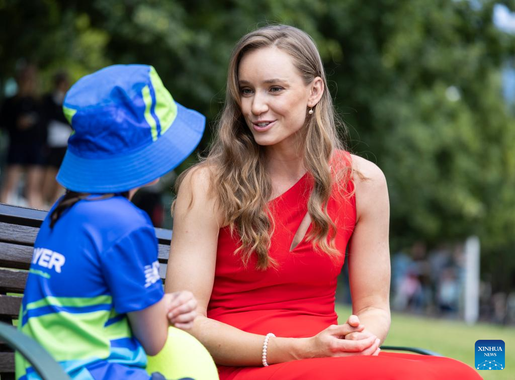 Elena Rybakina of Kazakhstan talks with a ballkid during the Australian Open winner photo shoot near Yarra River, Melbourne, Australia, Feb. 1, 2026. (Photo by Hu Jingchen/Xinhua)