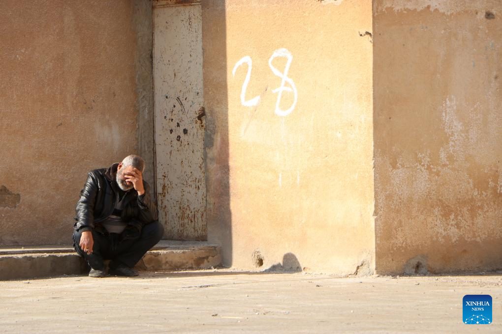 A displaced man rests in the courtyard of a school-converted shelter in Hasakah province, northeastern Syria, Jan. 29, 2026. (Str/Xinhua)
