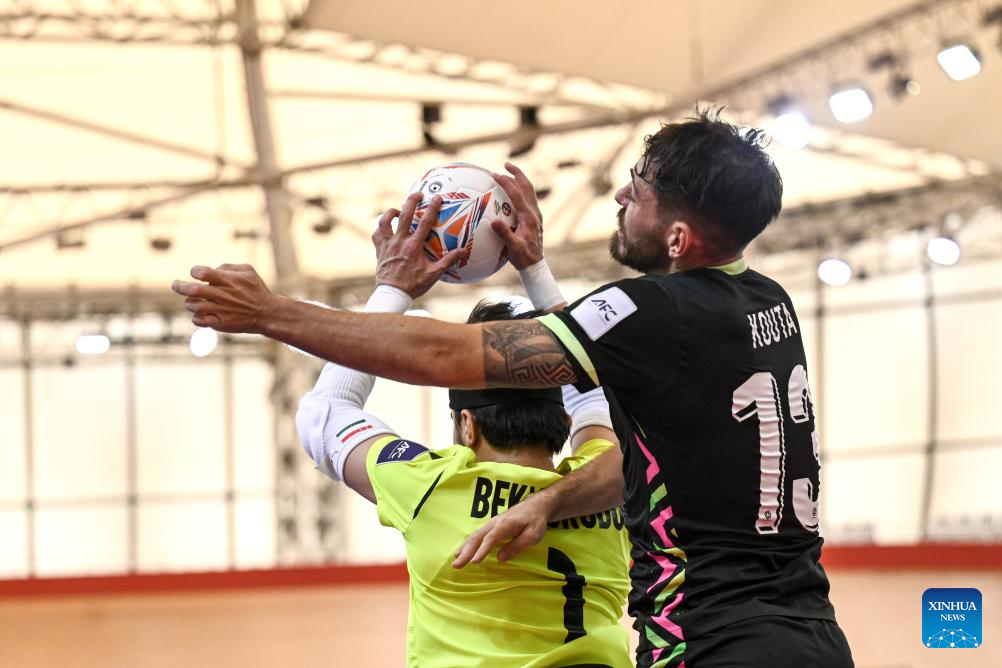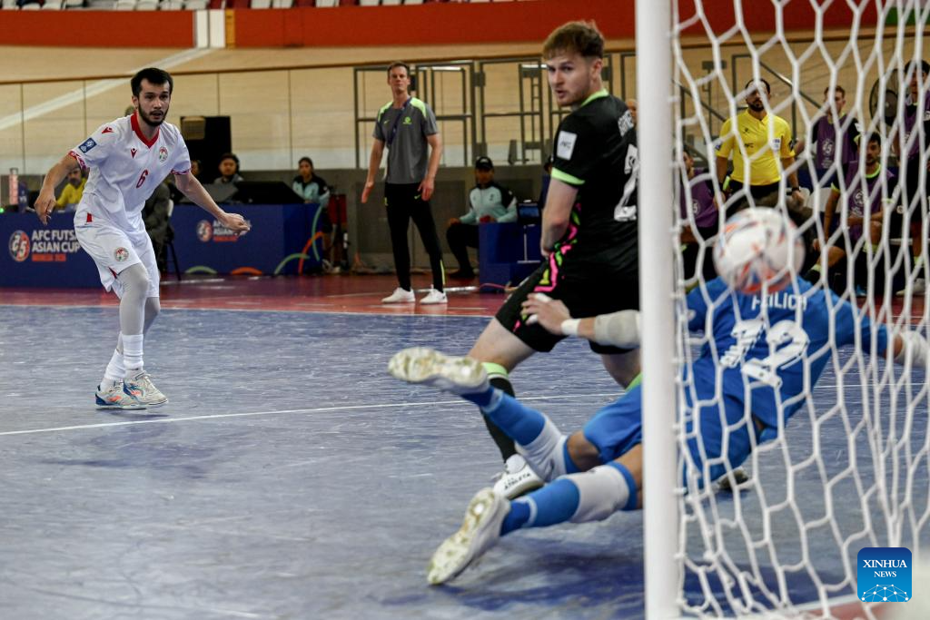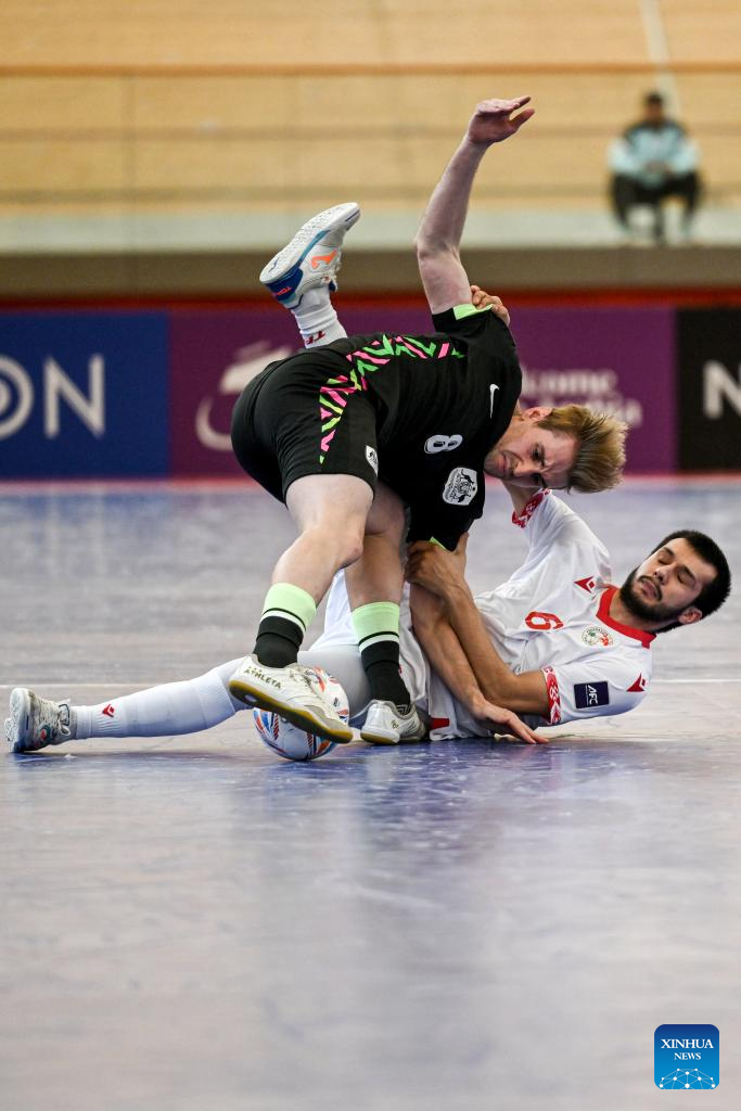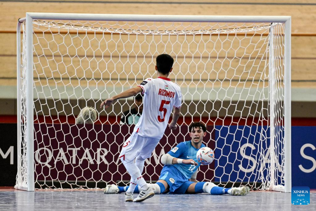 Yorov Idris (L) of Tajikistan shoots during the Group C match between Tajikistan and Australia at the AFC Futsal Asian Cup 2026 in Jakarta, Indonesia, Feb. 1, 2026. (Xinhua/Agung Kuncahya B.)