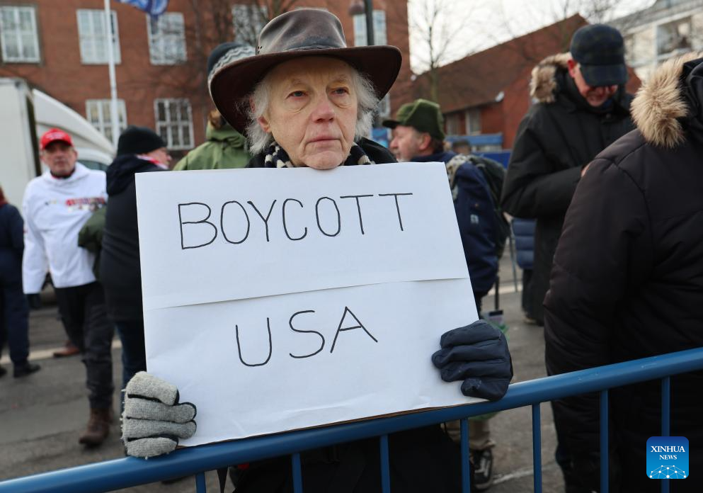 A protester holds a "BOYCOTT USA" poster near the U.S. Embassy in Copenhagen, Denmark, on Jan. 31, 2026. Thousands of Danish citizens and veterans held a "silent march" in Copenhagen on Saturday afternoon to protest recent controversial remarks made by U.S. President Donald Trump, who had downplayed the contributions of NATO soldiers, said local media. (Photo by Anders Kongshaug/Xinhua)