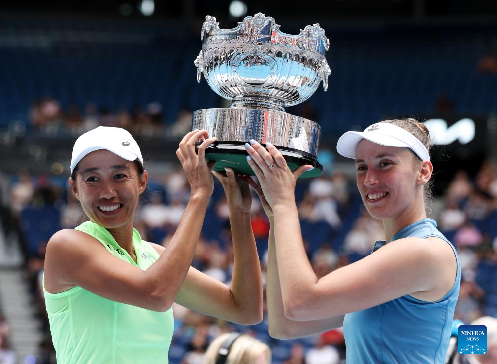 Zhang Shuai (L)/Elise Mertens hold the trophy during the awarding ceremony for the women's doubles final match between Zhang Shuai (China)/Elise Mertens (Belgium) and Anna Danilina (Kazakhstan)/Aleksandra Krunic (Serbia) at the Australian Open tennis tournament in Melbourne, Australia, Jan. 31, 2026. (Xinhua/Ma Ping)