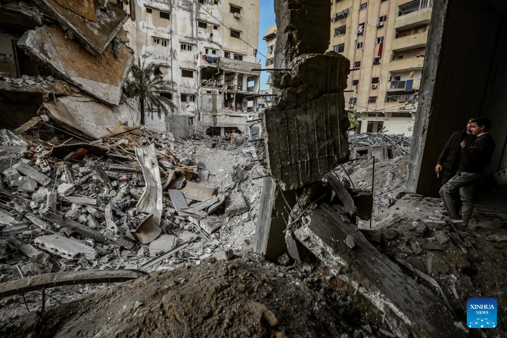 Palestinians inspect the damage following Israeli airstrikes in Gaza City, on Jan. 31, 2026. At least 32 Palestinians were killed in a series of Israeli airstrikes across the Gaza Strip late Friday and midday Saturday, Palestinian sources said, with attacks targeting a police station, residential apartments and displacement tents.