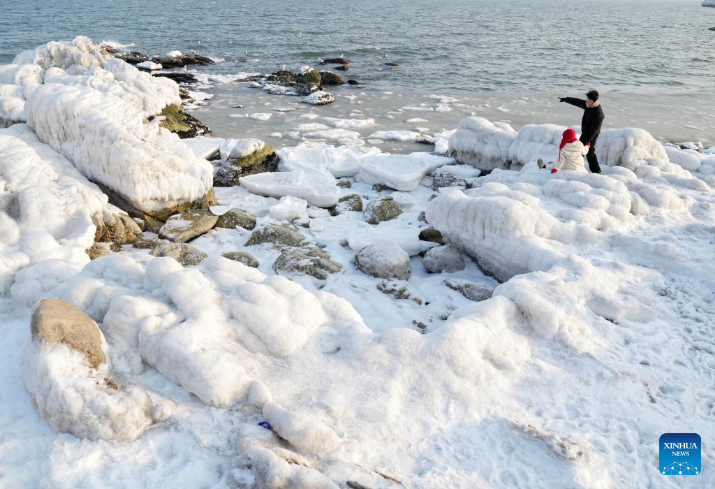 Tourists visit a beach covered with sea ice in Beidaihe District of Qinhuangdao, north China's Hebei Province, on Jan. 31, 2026. (Xinhua/Yang Shiyao)