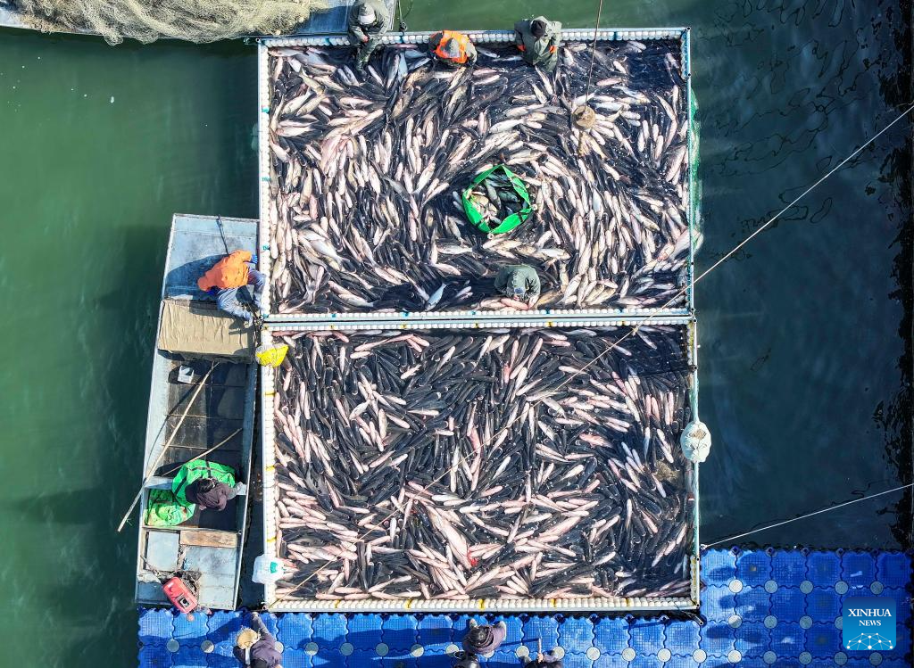 A drone photo shows fishermen fishing during a winter fishing event in Taizhou, east China's Jiangsu Province, Jan. 31, 2026. (Photo by Gu Jihong/Xinhua)